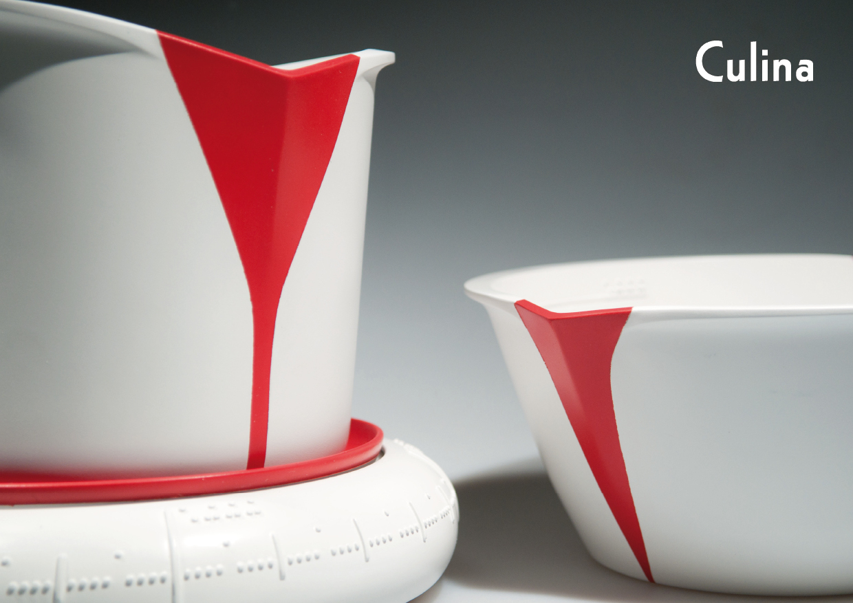 CULINA QU The measuring cup Culina Qu readopts the principle of Culina X : measuring and transferring, carrying and positioning with both hands, squeezing and pouring. On the inside of Culina Qu there is a tactile Braille lettering scale. Due to the special height and angle of the wall, each end of the scale can be reached easily with the index finger. The thumb remains free and can position a bottleneck safely, so that nothing spills during the filling. The total size of the measuring cup corresponds to the size of a hand.